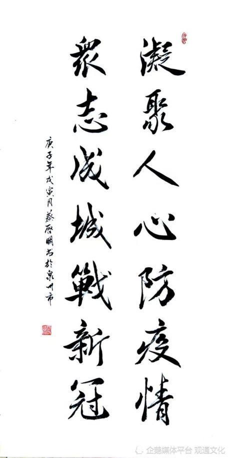 2020 年 2 月,为抗击新冠疫情,全国各地人民万众一心、同舟共济,作为一名书法家,在做好自身防护同时,以实际行动书写对联原创“凝聚人心防疫情 众志成城战新冠”的书法作品讴歌战斗在疫区前线的最美中国人,参加各种网络联展。此幅作品被泉州市丰泽区档案馆收藏。