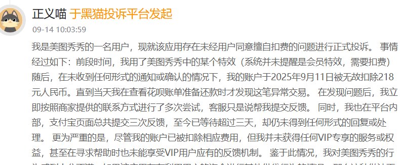 而在消费者投诉平台黑猫投诉,有9700余条投诉与美图旗下的美图秀秀、美颜相机和wink相关。其中大量投诉涉及“自动扣费”“恶意扣费”“乱扣费”等费用问题。其中,有消费者在9月14日提交投诉称,“前段时间,我用了美图秀秀中的某个特效(系统并未提醒是会员特效,需要扣费)随后,在未收到任何形式的通知或确认的情况下,我的账户于2025年9月11日被无故扣除218元人民币。直到当天我在查看花呗账单准备还款时才发现这笔异常交易。 ”