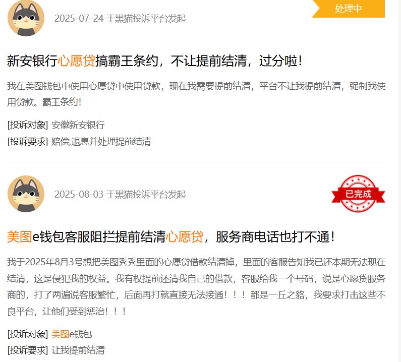 另外,锌刻度留意到,还有不少投诉和美图的“心愿贷”相关,不少消费者提到,自己在美图秀秀旗下的心愿贷借款,遭到催收,“暴力催收,恐吓,还骚扰家人”。此外,也有消费者提及自己想提前结清贷款,“但客服告知无法提前结清”。