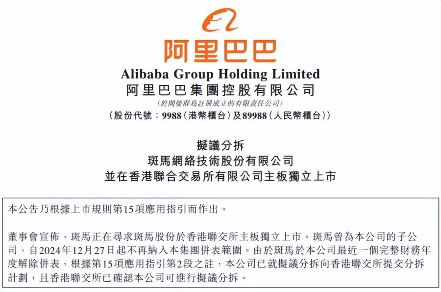 8月21日,阿里巴巴集团在香港联交所公告,拟议分拆斑马智行,并在香港联合交易所有限公司主板独立上市。