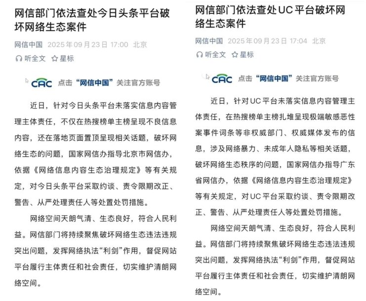 同时,针对UC平台存在类似违规行为,国家网信办指导广东省网信办同步开展执法。UC平台在热搜主榜集中推送未经权威部门或主流媒体核实的极端敏感案事件词条,部分内容涉及网络暴力、泄露未成年人隐私等违法违规信息,造成恶劣社会影响。上述行为同样违反了《网络信息内容生态治理规定》关于平台主体责任的要求。对此,主管部门已依法对其实施约谈、责令限期改正、警告处理,并督促平台严肃追究责任人责任。