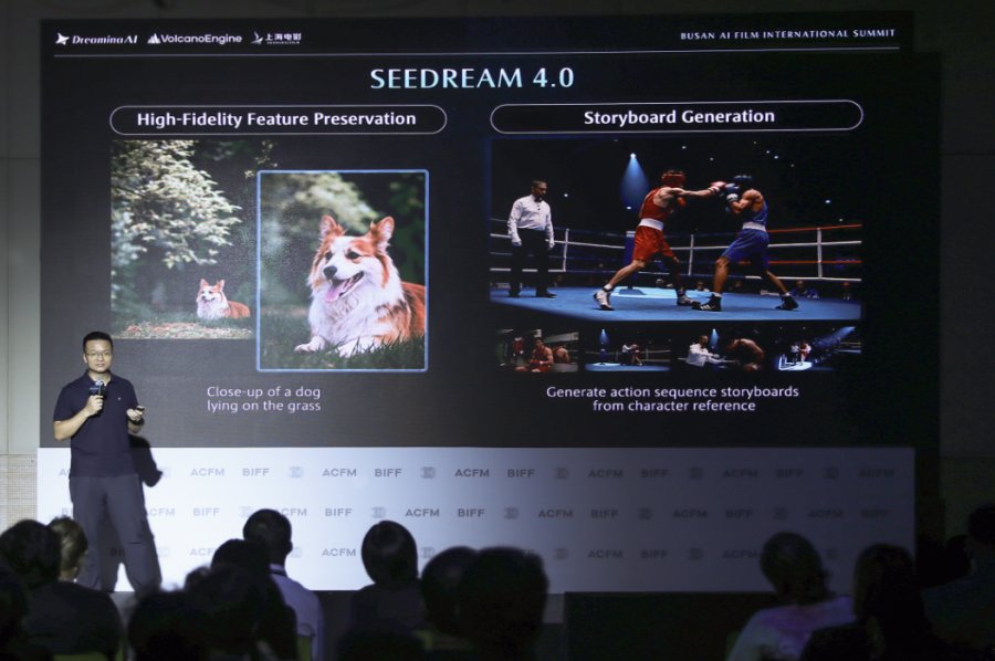 9月22日,即梦AI、火山引擎和上海电影,在釜山国际电影节InnoAsia平台举办“未来影像”AI电影国际峰会,几位入围者被邀请到现场,与中国导演梁鸣、韩国导演金泰勇、制片人李少伟、摄影指导夏永康、美术指导王竞等展开交流对话。