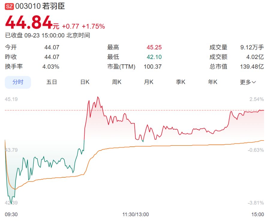 2024年底以来,若羽臣股价持续上涨,超过10倍。截至9月23日收盘,若羽臣股价为44.84元,上涨1.75%,市值为139.48亿元。