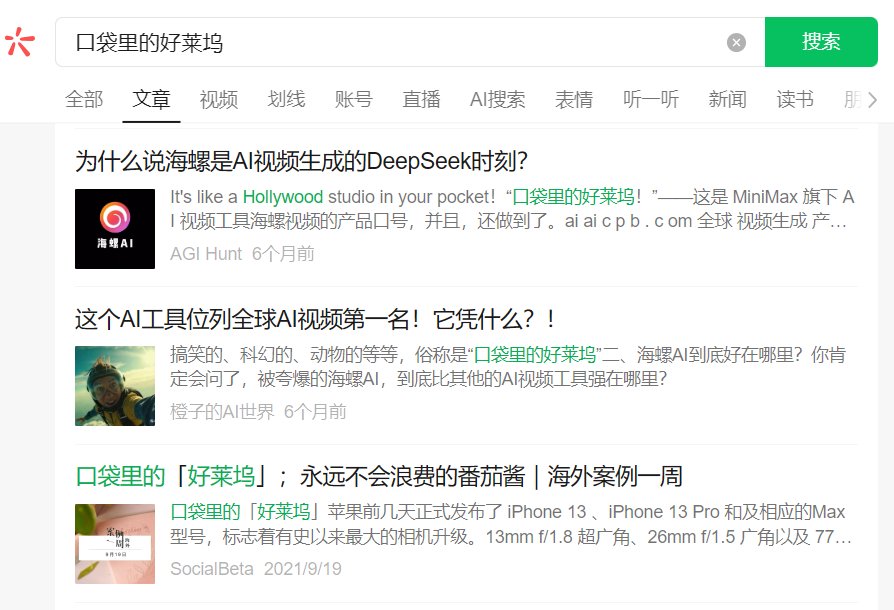 新识研究所搜索发现,使用“口袋里的好莱坞”作为关键字搜索,不少条目都是海螺AI的推广文章,连苹果过去也曾以其自居。
