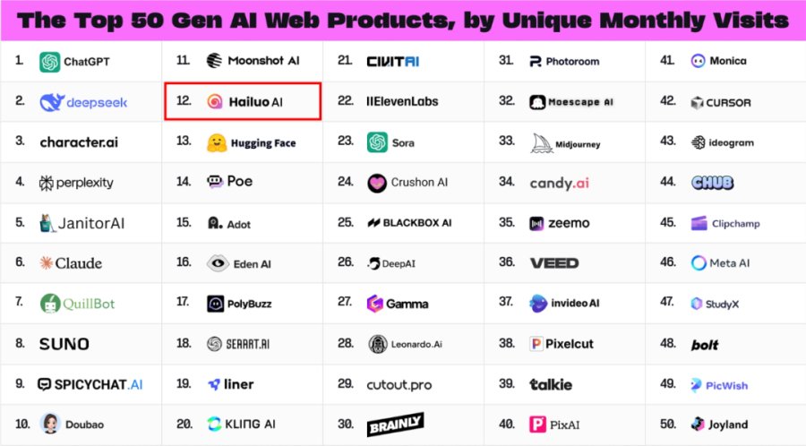 值得注意的是,今年3月,知名投资机构a16z发布的2025年全球Top50 AI应用榜单显示,海螺AI在用户活跃度、技术社区评分和指令遵循能力三项关键指标中均位居榜首,综合排名全球第12,拿下AI视频生成赛道的全球第一,超越了快手的可灵和OpenAI的Sora。