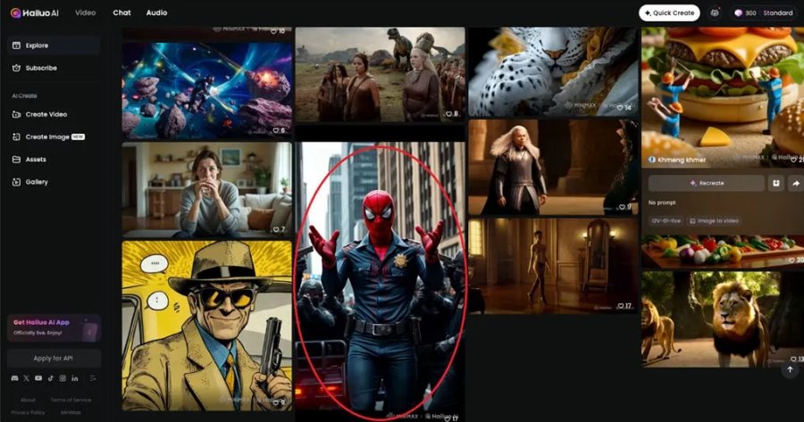 二是服务应用阶段的侵权:在海螺AI上线运营后,原告进一步指控,当用户输入诸如“蜘蛛侠在摩天大楼间摆荡”或“小黄人跳舞”等提示词时,系统会直接生成、公开传播并允许用户下载包含知名角色形象的图像或视频内容。这些输出结果并非抽象风格化表达,而是与原告作品在角色外观、色彩搭配、场景构图等方面高度趋同的复制或衍生作品。