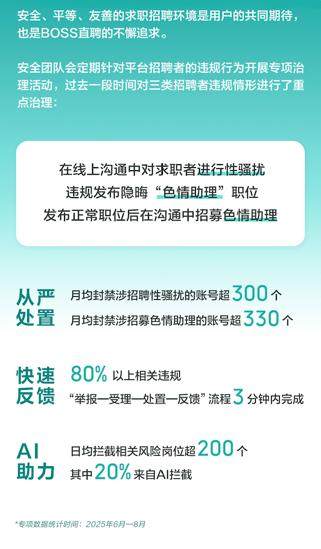 据京报网报道,9月23日,国内知名招聘平台BOSS直聘正式发布《招聘者违规行为专项治理进展通报》,披露 2025年6月至8月针对平台涉黄及性骚扰类违规行为的专项治理成果:累计封禁相关违规账号近2000个,其中月均封禁涉招聘性骚扰账号超300个,月均封禁涉招募色情助理账号超330个,多项升级治理手段即将转为常态化运行。