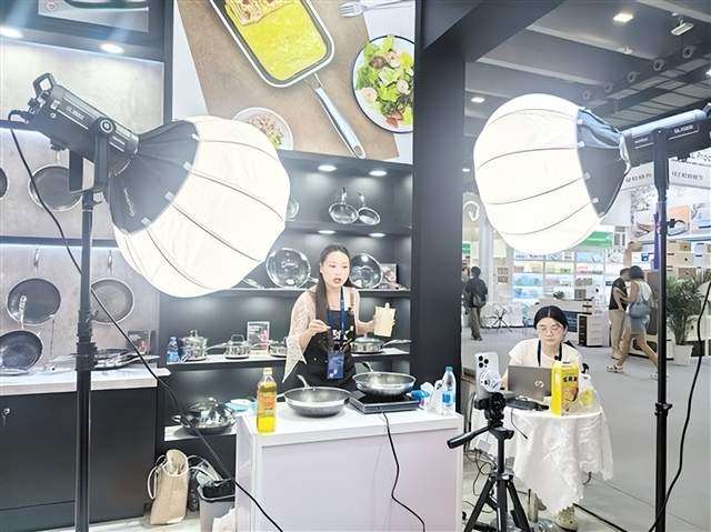 江门市依山金属制品有限公司携自主品牌“WBKN”亮相展会,并创新性地在展位前搭建直播间,实现线上线下联动推广。企业代表介绍,公司坚持“同线同标同质”生产,采用相同的材质、生产线和模具体系,同时针对国内市场需求优化设计细节,实施差异化产品策略。通过将传统“蜂窝”结构升级为3D旋风设计,产品不黏性能和耐用性显著提升。