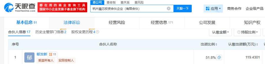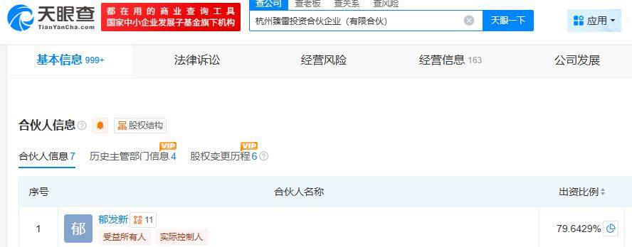 天眼查数据显示,郁发新为杭州晨芯投资、杭州臻雷投资、杭州睿磊投资三家合伙企业的受益所有人、实际控制人。