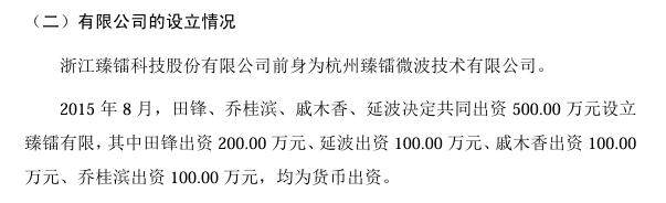 臻镭科技2021年6月提交的招股书显示,臻镭科技的前身为杭州臻镭微波技术有限公司(臻镭有限),创建于2015年8月,由田锋、乔桂滨、戚木香和延波四个人出资设立。其中田锋出资200万元,占股40%;戚木香出资100万元,占股20%。