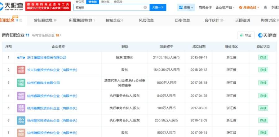 天眼查显示,郁发新除了在臻雷科技任职,还在长兴仙童投资合伙企业等六家存续企业中任职