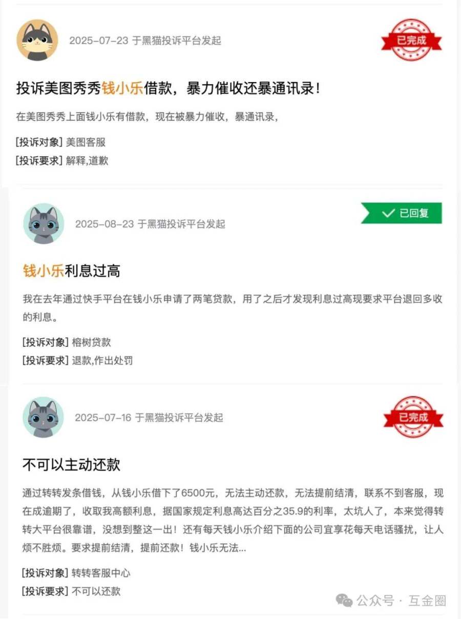 除“榕树贷款”外,百融云创旗下还有另一助贷产品“钱小乐”,两者均为消费贷。在黑猫投诉(新浪旗下)上,关于“榕树贷款”和“钱小乐”的投诉达数千条,投诉内容主要为:涉嫌收取担保费、服务费,实际借款年化达/超36%,暴力催收等。