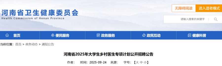 为提升乡村医疗卫生服务水平,补充和优化乡村医生队伍,促进医学专业高校毕业生就业,根据《省委编办等五部门转发中央编办等部委关于继续做好大学生乡村医生专项计划编制保障工作的通知》(豫编办〔2025〕93号)和河南省卫生健康委员会、中共河南省委机构编制委员会办公室、河南省教育厅、河南省财政厅、河南省人力资源和社会保障厅《关于做好2025年大学生乡村医生专项计划公开招聘工作的通知》(豫卫基层〔2025〕12号)精神,结合我省实际,现面向社会公开招聘大学生乡村医生283名。招聘方案公告如下: