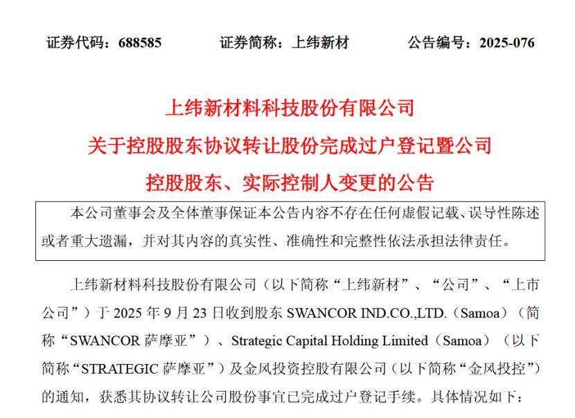 9月23日,上纬新材料科技股份有限公司(SH:688585,下称“上纬新材”)发布公告称,该公司于收到到股东SWANCOR萨摩亚、STRATEGIC萨摩亚及金风投控的通知,获悉其协议转让该公司的股份事宜已完成过户登记手续。