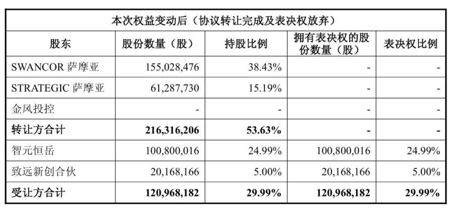 转让完成后,SWANCOR萨摩亚、STRATEGIC萨摩亚、金风投控合计持股比例从83.62%降至53.63%,智元恒岳和致远新创合伙合计持股比例从0%增至29.99%,且转让完成后,上纬投控持股主体将放弃行使其所持股份的表决权。