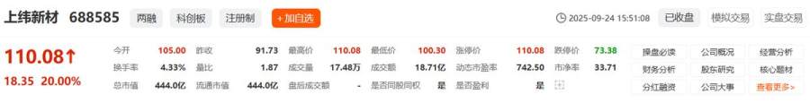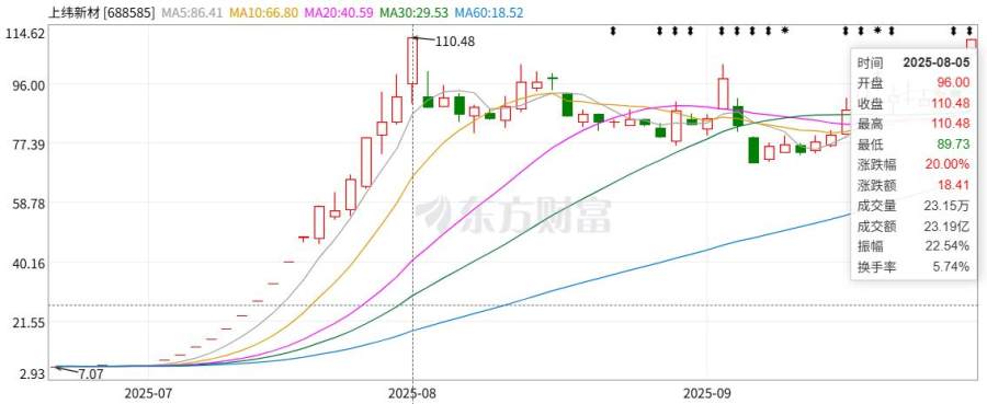 实际上,自2025年7月初宣布与智元恒岳的股权交易计划以来,上纬新材便一跃成为在A股市场上高唱凯歌的“牛股”,股价一度由7月低位的7.78元/股飙升至9月25日的132.10元/股,总市值也呈翻倍增长态势。