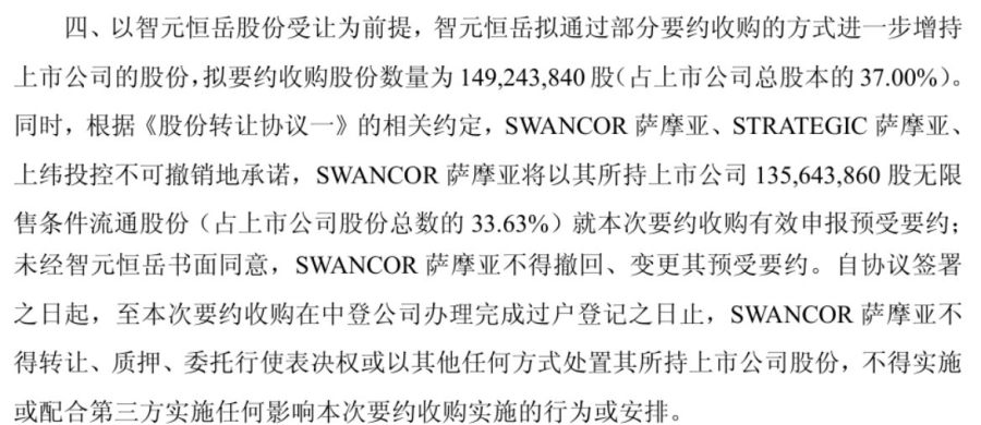 同时,根据股份转让协议相关约定,上纬新材原持股方不可撤销地承诺,SWANCOR萨摩亚将以其所持1.36亿股股份(占总股本的33.63%)就本次要约收购进行有效申报并预受要约,为后续要约收购事宜提供了关键支撑。