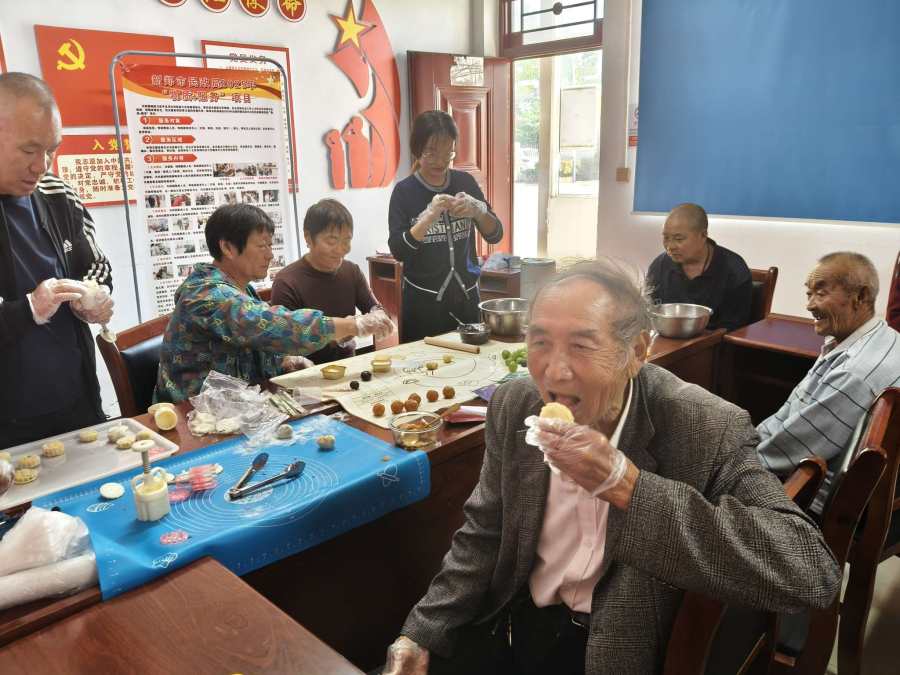最受期待的月饼 DIY 环节中,志愿者早已将面团、馅料分好分量,手把手教老人们揉面、包馅、压模。81 岁的王奶奶手部灵活度不足,志愿者小周耐心协助她完成了人生第一个 DIY 月饼:“这个月饼要带回家给重孙子,让他尝尝奶奶做的!”