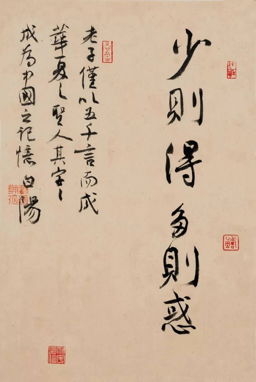 书画也是这样,跑集团、跑沙龙、跑展览,该浪费多少时间。这是一种迎合市场的方式,是钻空子,钻艺术与生活之间的空子,寻的是时尚。这样的东西多了,艺术家也会迷失艺术方向。1980年代,西方文艺思潮、美学思潮猛吹,再过几年,中国的文艺理论界竟哑然失语。为什么?没有了主见,没有了自己。用老子的话讲,这就叫“多则惑”。夏天,雨下多了,叫“淫雨天气”。人间交往,有“升恩斗仇”之说。这都可算作是“多”得出了格,越了位,让事物的性质起了变化,造成不好的效果。所以,人遇到事情,理想也罢,不理想也罢,都要“吾日三省吾身”。尤其不理想的,更要多从自己方面想一想。不要只想往客观方面推,那个没用,有用的是自己要明白。这话说一说容易,真做到也很不容易。明白不是聪明,是真正的大智慧。《水浒传》中的白衣秀士王伦是个聪明人,但决不是个明白人。做明白人要读《老子》,学《老子》,可为当为,不可为则不为。在这一点上,不必学习诸葛亮。人都希望有成就,取得成就既容易也不容易。说容易是只要思想对路,认识对路,行为对路,就能做到。说不容易是人人都会以为自己对路,不对路也会觉得对路。所以要去掉心头魔障,去掉无穷无尽的欲带来的无穷无尽的惑,更多的是集中时间、集中精力,写出精品力作,甚至是传世之作。这是“少”,却胜于“多”。它因“少”而“得”,远比那虽然“多”却是一堆浑浑沌沌的“惑”更有意思,更有味道。