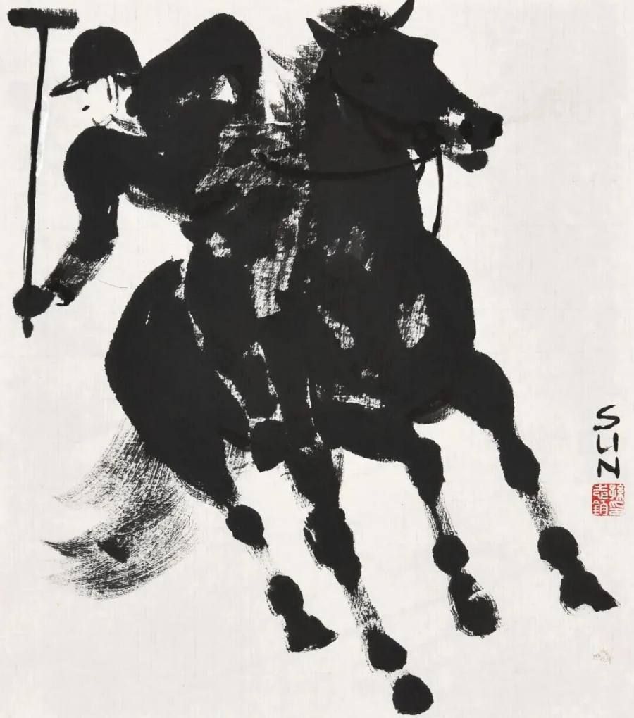 其构图多用两法:或以大空衬小形,阴阳对照,使长风得以通行;或以近距斜角摄动势,黑白叠映,顷刻聚力。人在画里,不过几笔、数面,然神情自存;马在画里,不过数形、数点,然筋骨自成。此处功夫,不靠花巧,全凭写生。对景写生多年,寒暑不辍;关节处何以转,肌肉处何以起,皮毛处何以亮,皆烂熟于心。故能以简御繁,以少胜多。