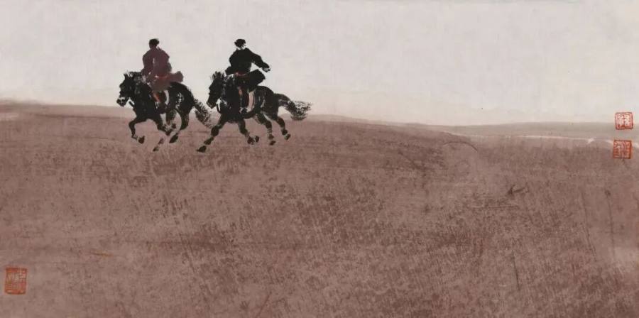 山河有声,风入旷野,草色在云根间浮沉。马影并行,蹄声断续,天地阔远如初。艺林多路,或炫耀以奇,或驰逐以巧;而有一人,守清守简,以诚养笔,以静驭墨。观其画,知其心;听其线,识其骨。工以立形,意以安神;色不求繁,调自成章。广野低回,云幕如涛,人物与鞍马同在风影里,若行若停,皆含分寸。