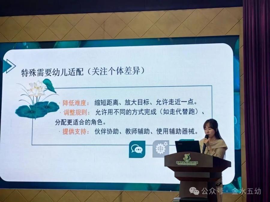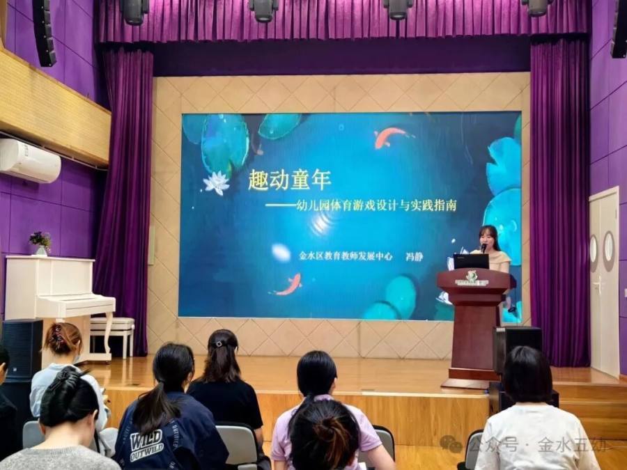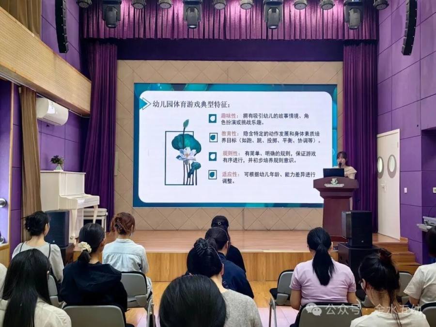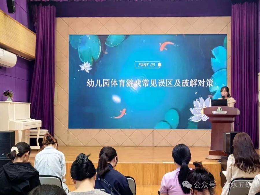 最后,王主任以“趣动童年”为题开展体育游戏专题培训,从幼儿园体育游戏“开展的现实价值”、“开展原则”、“常见误区及破解对策”、“设计策略”等五方面展开细致讲解,为新学期体育教学活动开展提供指导