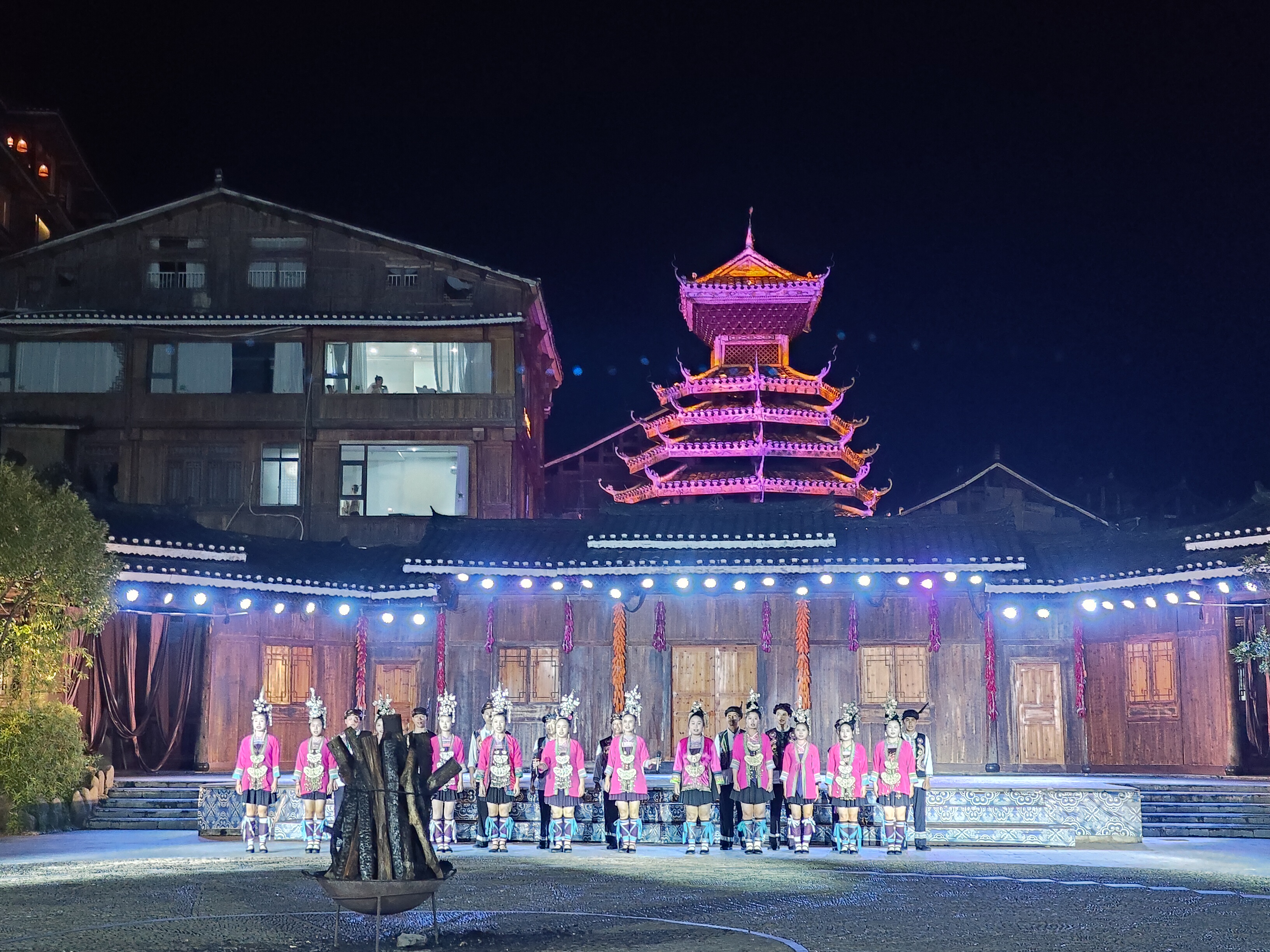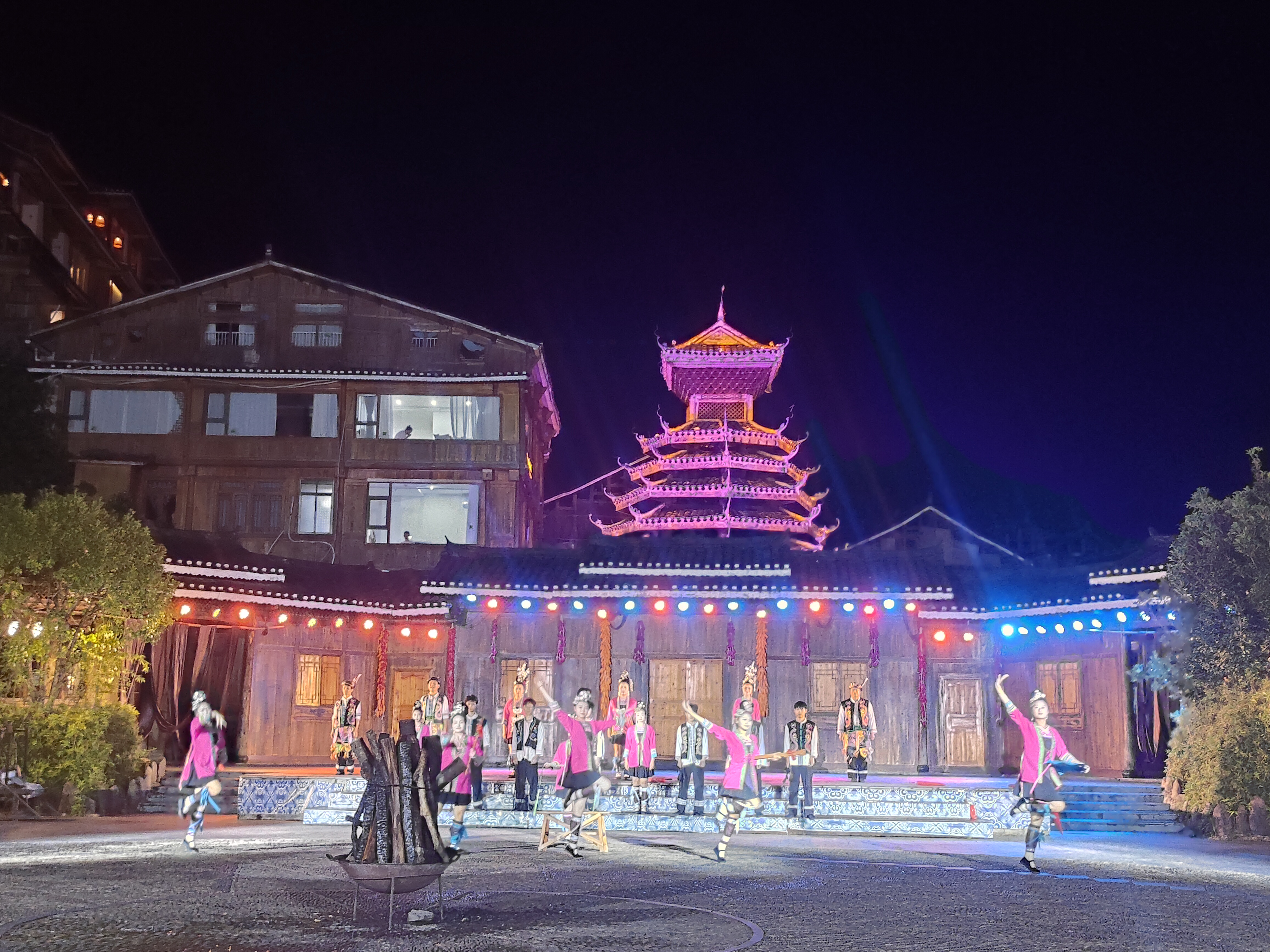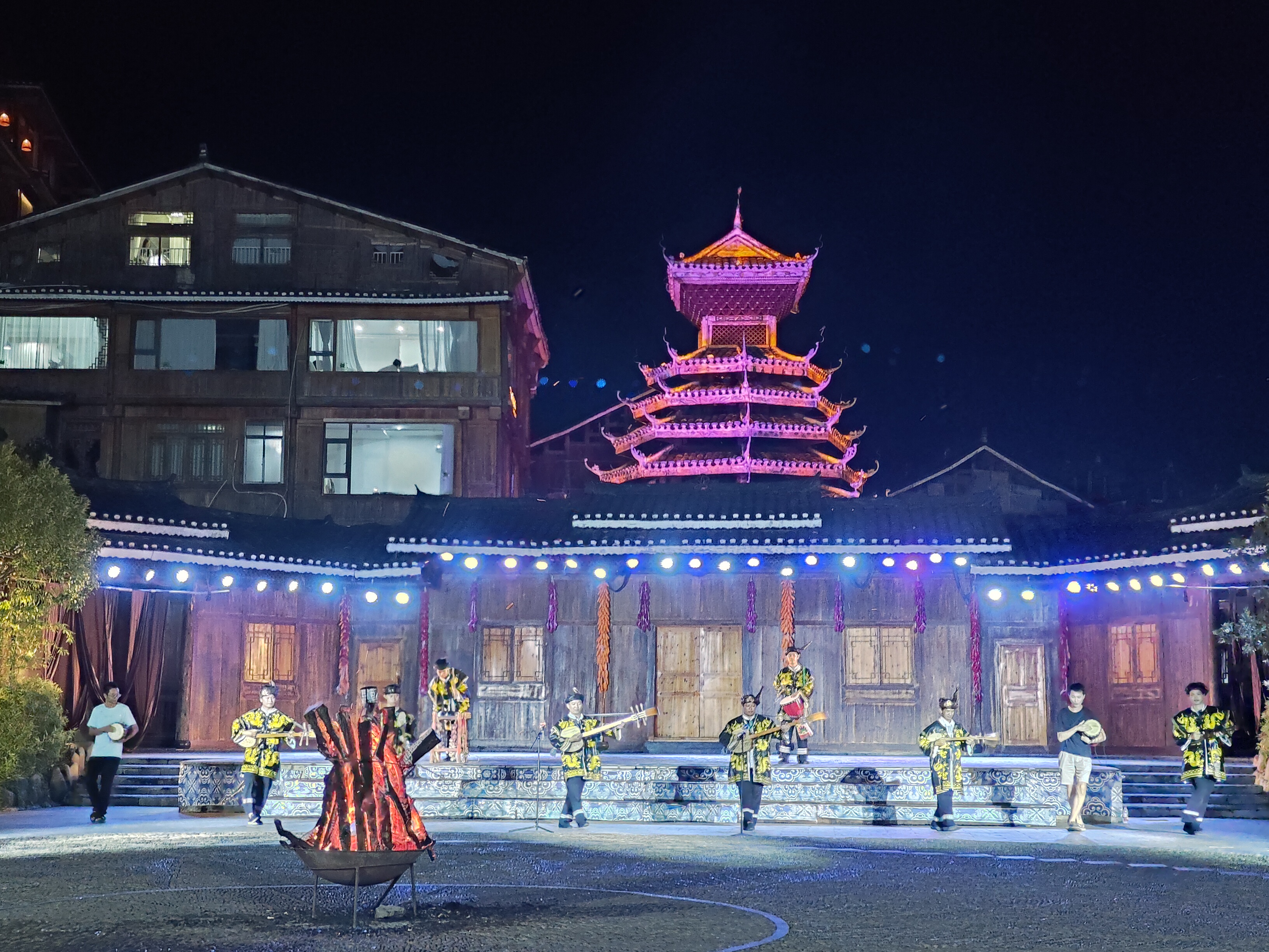 接下来,在场地的中央燃起了篝火,在红彤彤的篝火旁,充满民族风情的节目一个接一个上演,有情歌对唱,有芦笙舞,更令人赞叹不已的是无伴奏、无指挥的多声部合唱,这就是享誉音乐界的“侗族大歌”。侗族大歌是侗族人民的一种传统音乐形式,主要流行于黔东南地区的黎平县、从江县、榕江县等侗族聚居区,广西的三江侗族自治县也有存续。其内容,通常是模拟鸟叫虫鸣、高山流水等自然之音,侗族大歌结构严密而精美,前有歌头后有歌尾,中间是歌曲的主体部分,也就是音乐段式上常见的三段式。据历史考证,侗族大歌这一形式在秦代以前就有了,到了宋代,逐渐发展成熟。侗族大歌的发展与其鼓楼的居住形式,好客的风俗习惯,以及侗族语言有着分不开的联系。侗族大歌结构严密而精美,歌词押韵,曲调优美,歌词多采用比兴手法,意蕴深刻。2006年,侗族大歌荣登第一批国家非物质文化遗产名录;2009年,侗族大歌被联合国教科文组织列入人类非物质文化遗产名录。