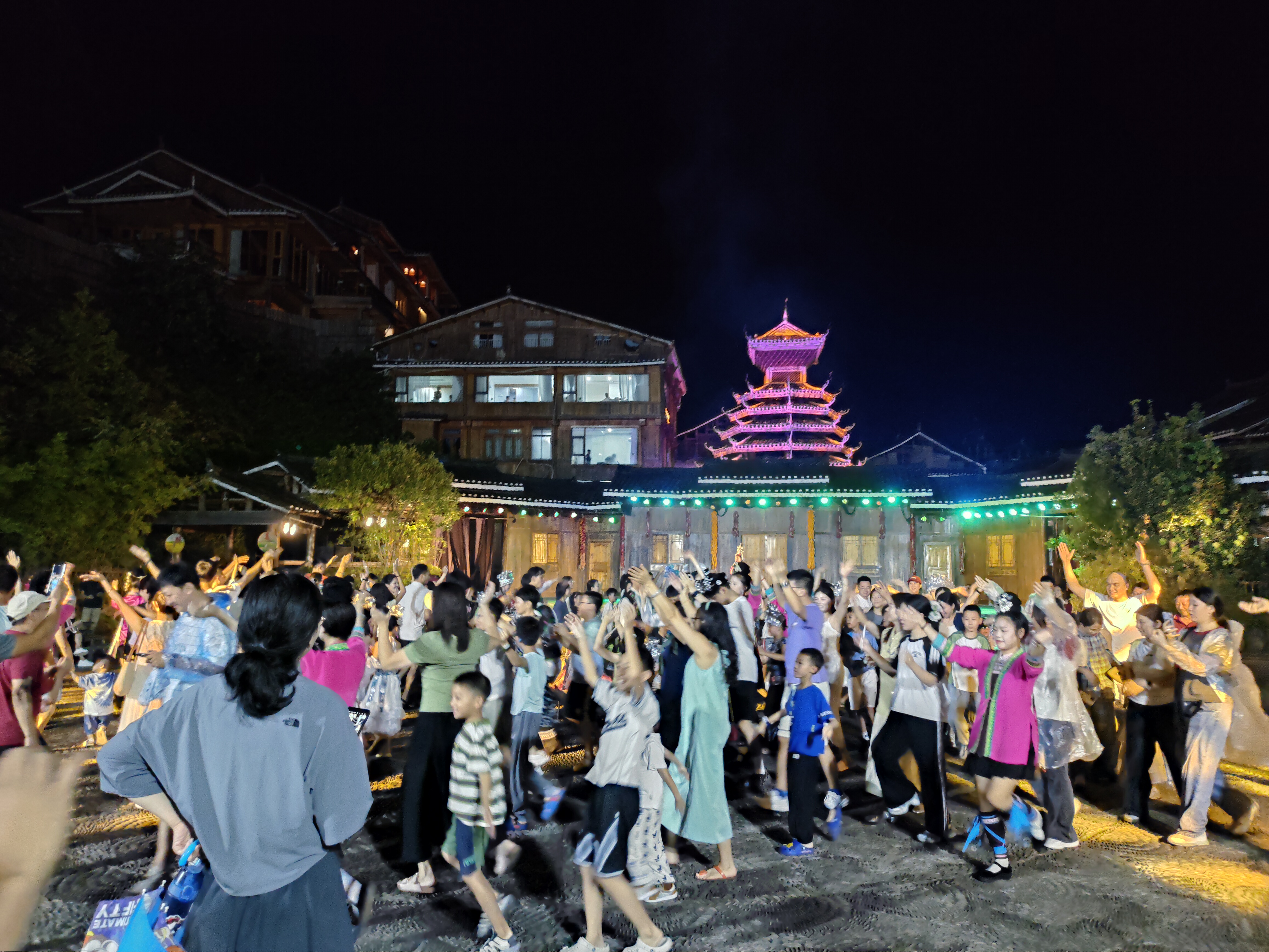 演出开始了,只见十几名身着民族盛装的侗族男女踏着音乐节奏缓步来到场地中间,唱了几句之后开始顺着观众席的边缘载歌载舞,一边伸出热情的双手,拉前排的观众入场,一起舞动,场上的气氛一下子被带动起来,成了欢歌热舞的海洋。虽然歌词一句也听不懂,却能完全感受到侗族人的好客之情。