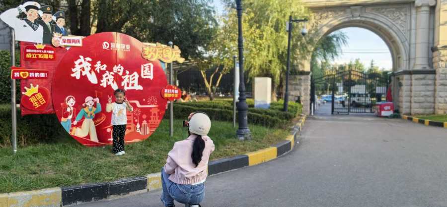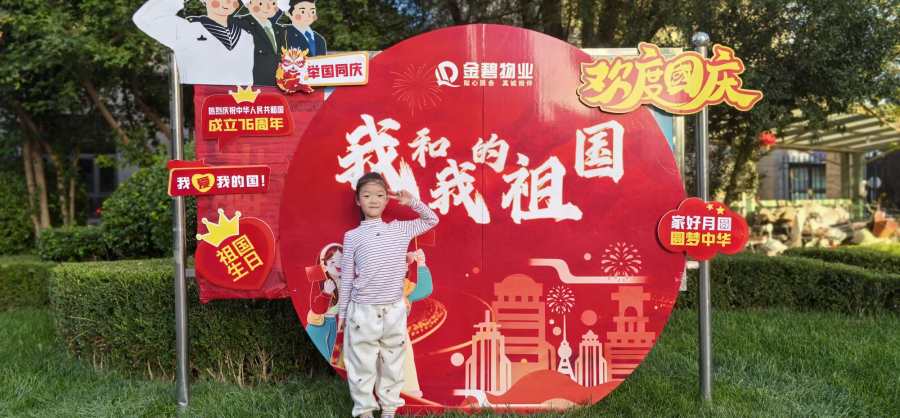 9月25日,运城恒大名都小区小朋友在小区物业精心布置的庆祝中华人民共和国成立76周年展板前留念。为了迎接国庆,小区不仅布置了展板还拉起了条幅,同时在通道上拉起了小红旗,营造出了浓浓的节日气氛。