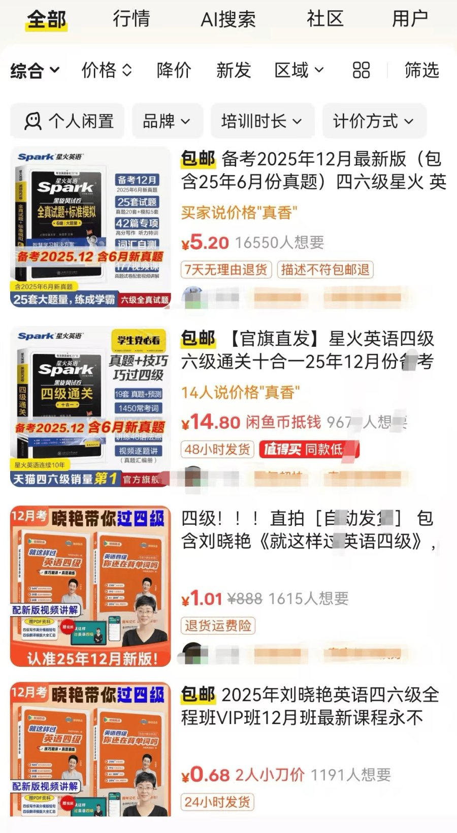 例如一套“过四级版”真题解析17.5元包邮。最新版四六级星火英语,包括12套真题、5套模拟试题、30篇作文及12套听力等,仅售卖15.6元,如果只购买视频,售价是5.20元。该链接显示有16550人“想要”。