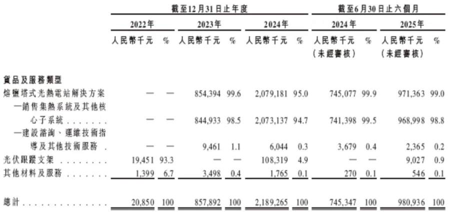 招股书显示,可胜技术的收入主要来自熔盐塔式光热电站解决方案,尤其是销售集热系统及其他核心子系统。2023年和2024年度,该板块贡献的收入分别约为8.45亿元、20.73亿元,占比分别约为98.5%、94.7%,2025年上半年为9.69亿元,占比为98.8%。