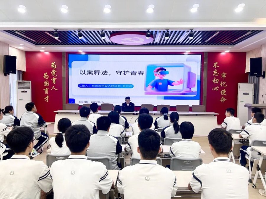 为全面落实《河南省教育厅办公室关于组织开展法治宣传教育周活动的通知》(教政法函〔2025〕507号)要求,将法治宣传教育周作为秋季开学法治第一课的重要内容,2025年9月24日下午,文化路街道农西社区郑州市第九中学学生发展处精心组织法治教育专题课堂。活动面向高一、高二年级各班班干部,由学生发展处主任王大昀主持,特邀学校法治副校长、郑州市中级人民法院张兴成法官主讲,切实推动“八五”普法规划在校园落地见效。