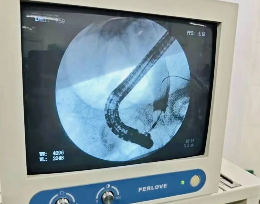 针对患者病情,消化内、外科医护团队多次开会研究讨论诊疗方案。患者有明确手术指征,腹腔镜下行胆总管切开取石手术风险较高,医疗团队决定为其在手术室实施ERCP胆总管取石手术。
