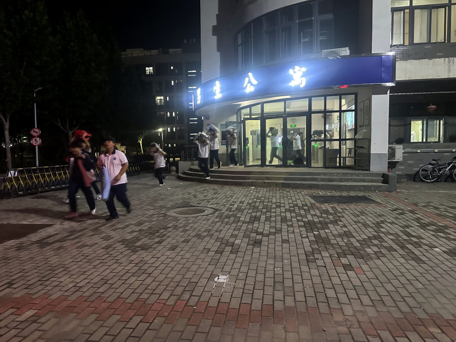 警报响起后,演练进入实战阶段。宿舍区内,同学们迅速利用枕头、被子等物品保护头部,就近躲避于墙角、床沿等安全三角区域;在走廊、楼梯等公共区域的学生则按要求护住头部,沿指定路线快速、有序向室外安全地带撤离。整个疏散过程指令清晰、动作规范、节奏紧凑,展现出师生良好的应急素养。