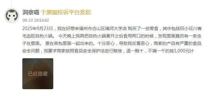 9月23日,一位消费者投诉称,在好想来福州市仓山区福师大学店购买了田小花川香毛血旺自热火锅,在食用过程中发现有虫子。