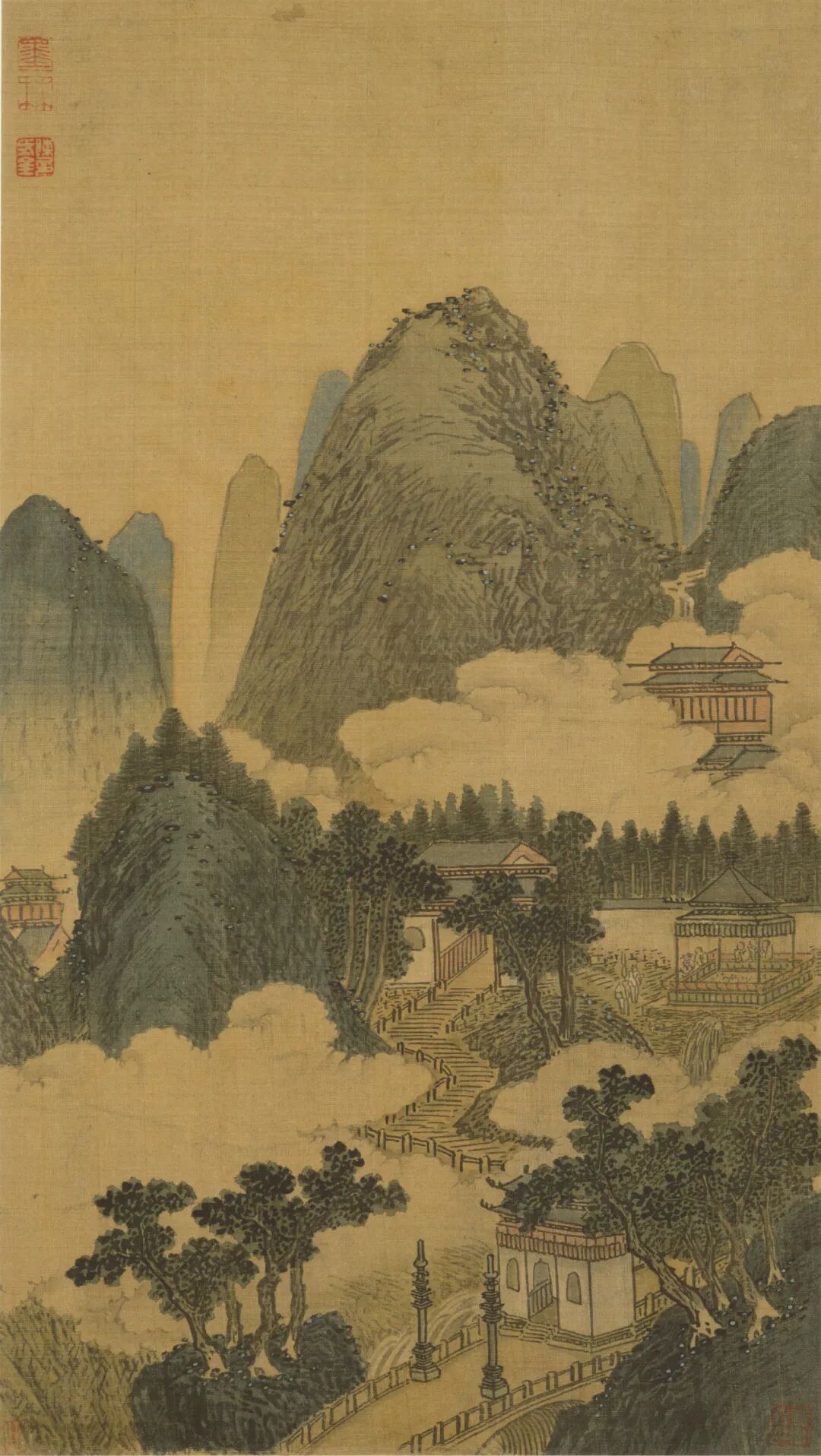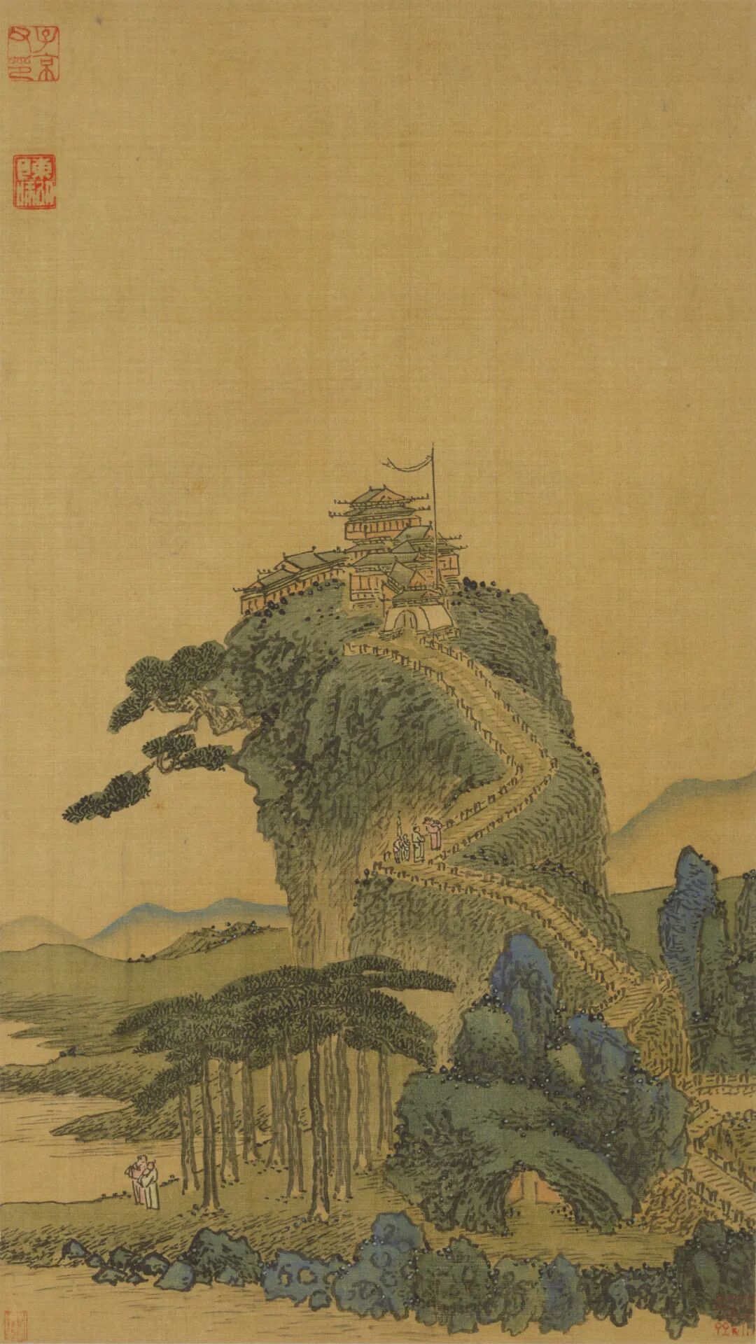 孤岫擎天,危磴蜿蜒上岭;楼观层叠,占峰为城。旌竿高举,檐牙相顾,苍烟在谷口回环。坡麓松林成阵,海蓝点苔闪光;山脚清溪抱岸,汀洲平铺。画家取高远法,留天宇大幅空明,以静统动,以虚摄实,风气朗润,意象开阔。