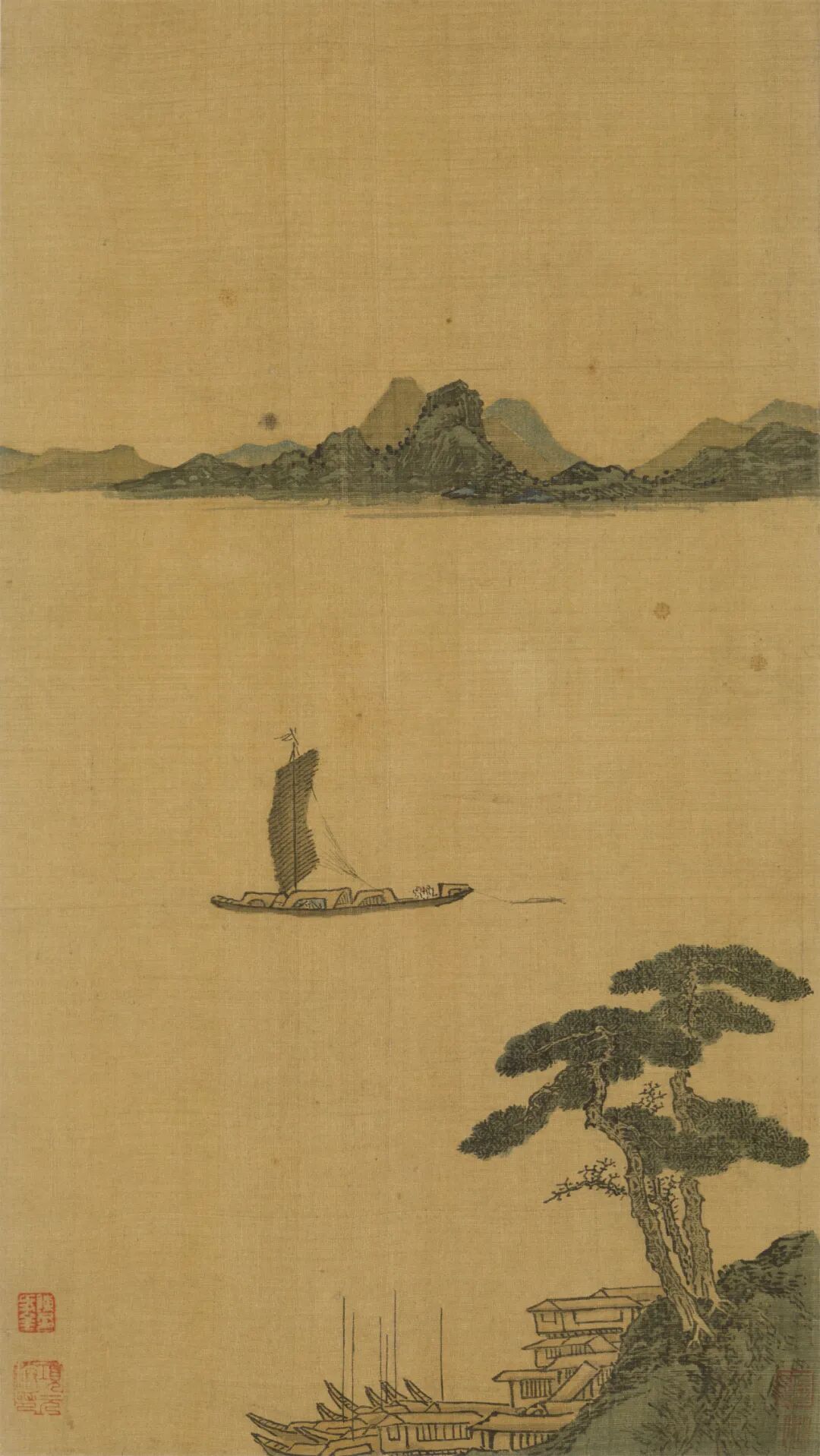 构景以空驭满,以一统群。孤帆为眼,危松为辅,港湾为脉,远岫为屏;动静相持,清厚相济。观者随帆心行,江面风清;俯听橹语,远闻潮声。格调高洁,气度闲雅。定名“沈周两江名胜图册·孤帆平湖”,以记湖天澄澈,帆影鸣秋。
