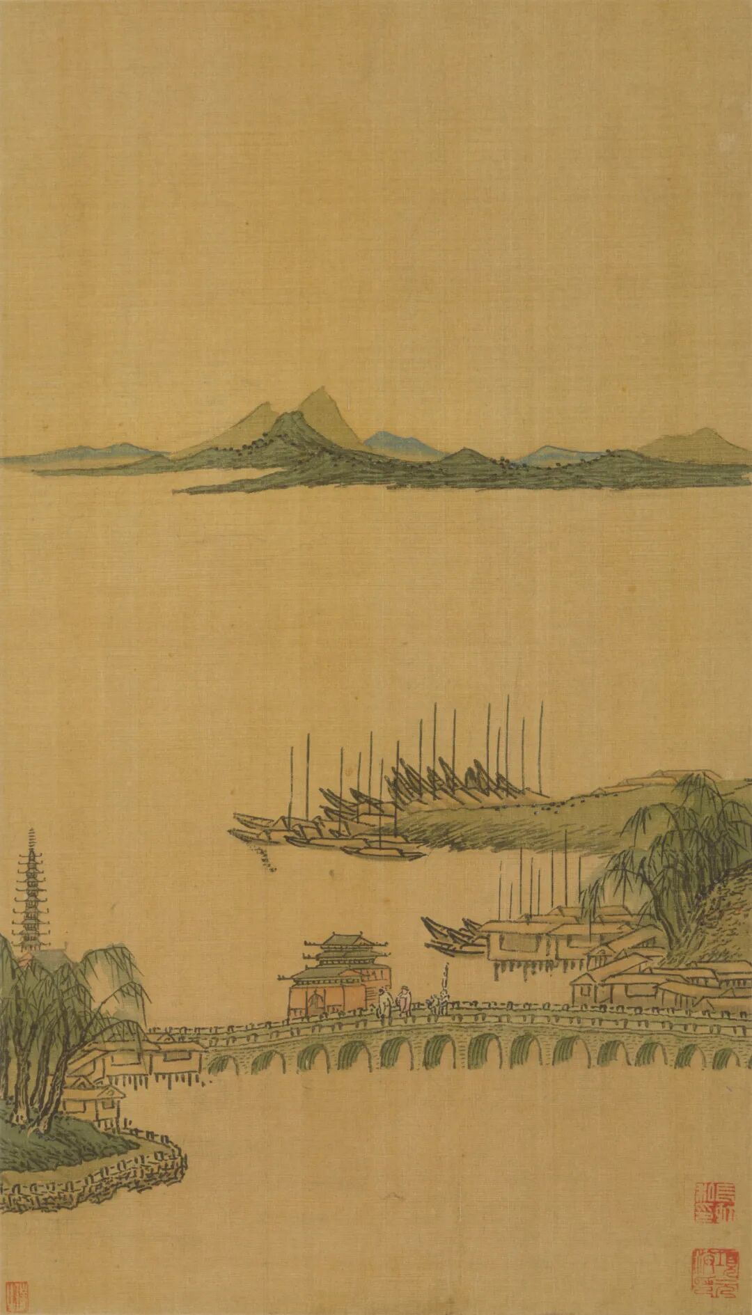 江天旷朗,远岫连绵,沙汀平铺。桥虹卧水,阙楼据中,塔影相望。柳外渔村,屋舍参差,市廛微启。帆樯列阵,泊舟成湾,潮痕浅映。画家以平远拓境,留空为主,江面澄清,风气清润,气象开阔。天光淡金,远音寂静。水闲