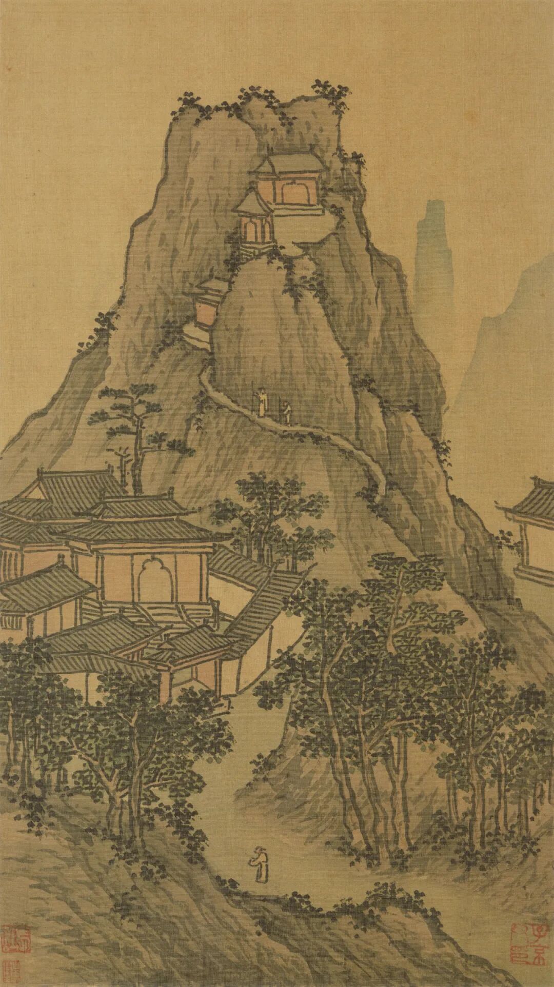 危岩拔地,山路回环,上有殿阁,中有回廊,层台倚壁。林木参差,石脊纵横,远岫淡抹。坡前屋宇相连,院落开合,门楣端肃。行旅二三,举杖徐行,风从峡口入,泉自涧隙鸣。构图取高远,峰躯作主,院群辅翼,势若龙盘。