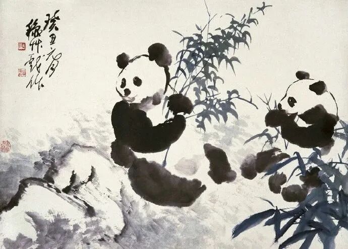 熊猫最见童心。大黑大白并置,块面相承,前肢后肢起落分明;耳目鼻口一两点成,神情立现。竹叶以快笔点成,冷墨斜飞,衬托圆体,清辉满幅。观其动,知其重;观其静,知其暖。