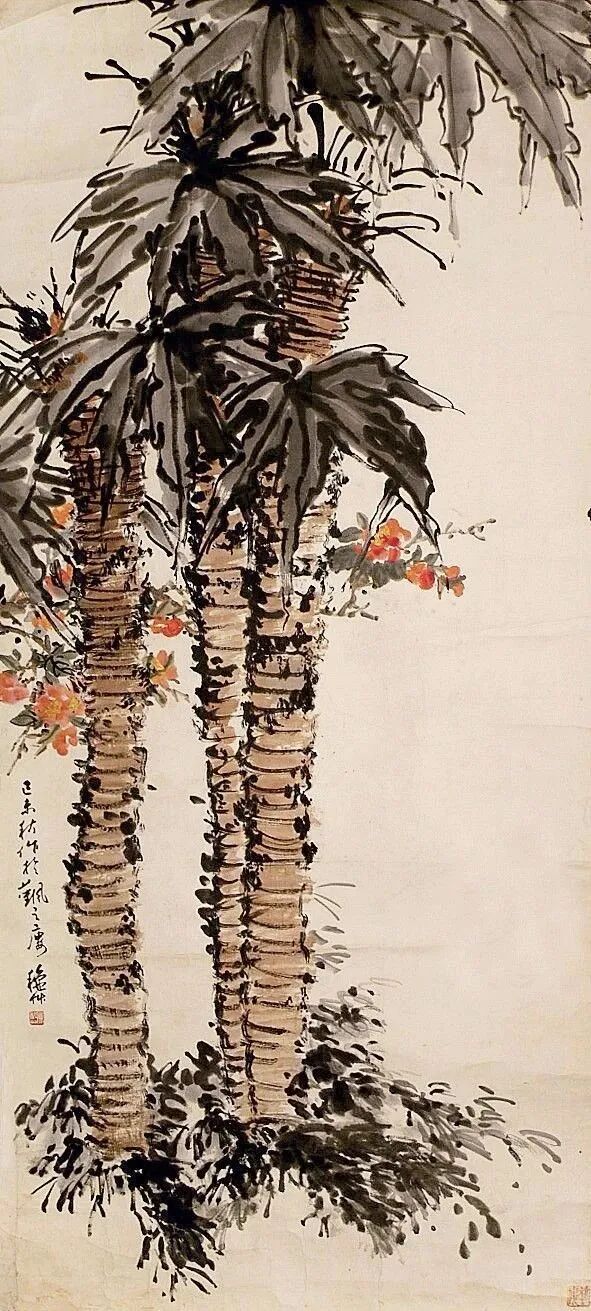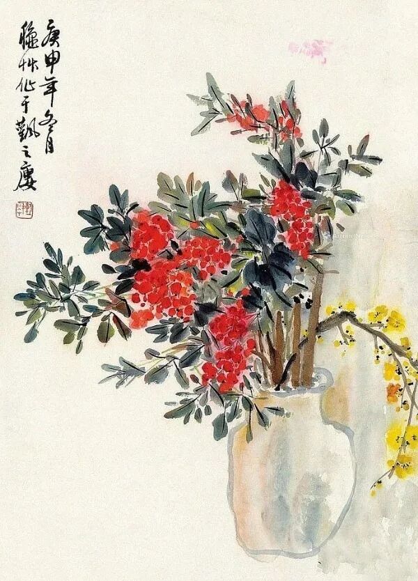 写意取骨不取貌,取势不取貌,取神不取貌。陈秋草握笔中锋,筋力直贯;或侧锋扫掠,叶面翻波;或破锋湿擦,瓣脊生润。墨从浓至淡,水由满到枯,黑若金石,灰若轻云。设色以花青、赭石、胭脂、洋红为主,层层提染,薄若酒晕,亮如晨曦。艳而不妖,明而不躁,冷暖相随,虚实互济。