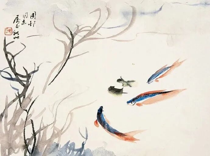 游鱼在水,画不多笔。背以花青,腹以淡赭,鳍以朱砂;一双黑点为睛,立时“醒来”。水草不纠,以长线、枯枝为影,空白广布,鱼行其间,轻若流光。枝头窃语,水底回声,皆在想象。