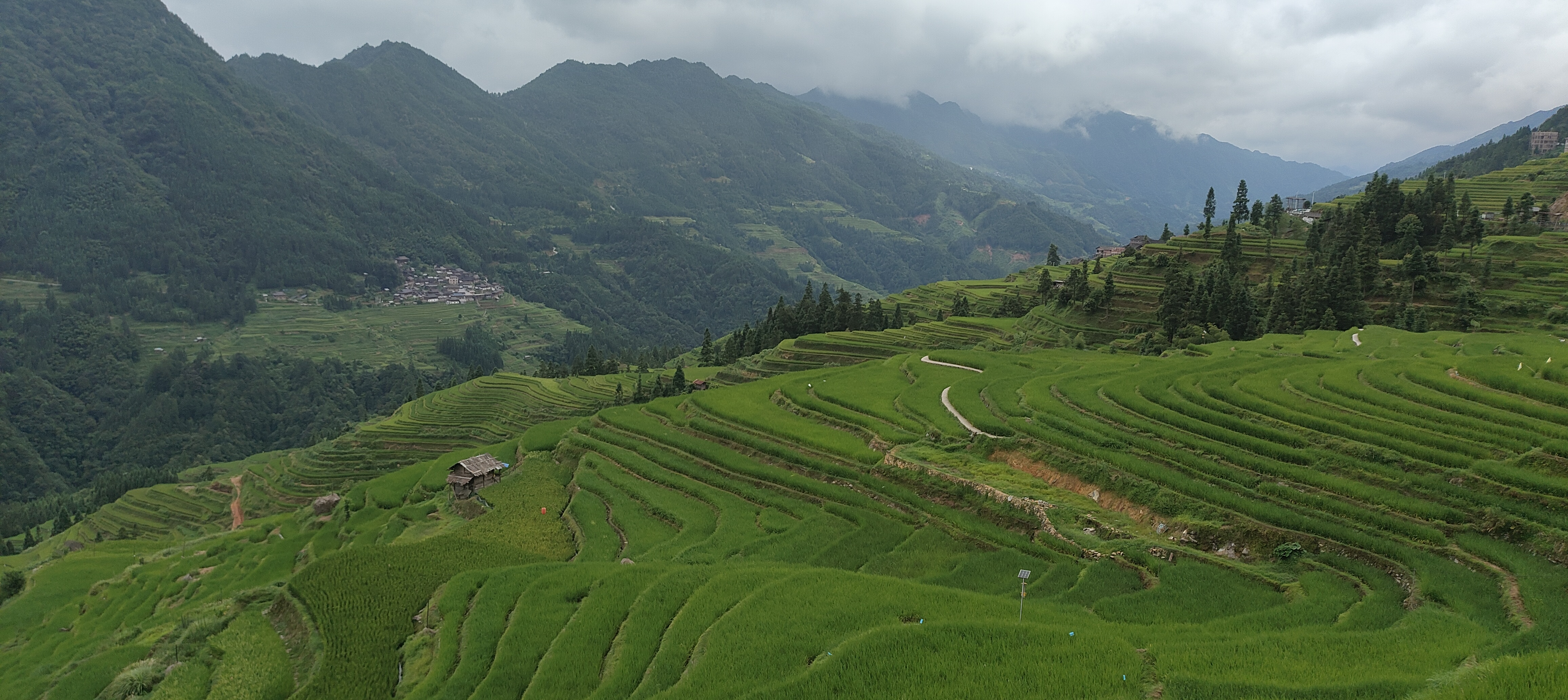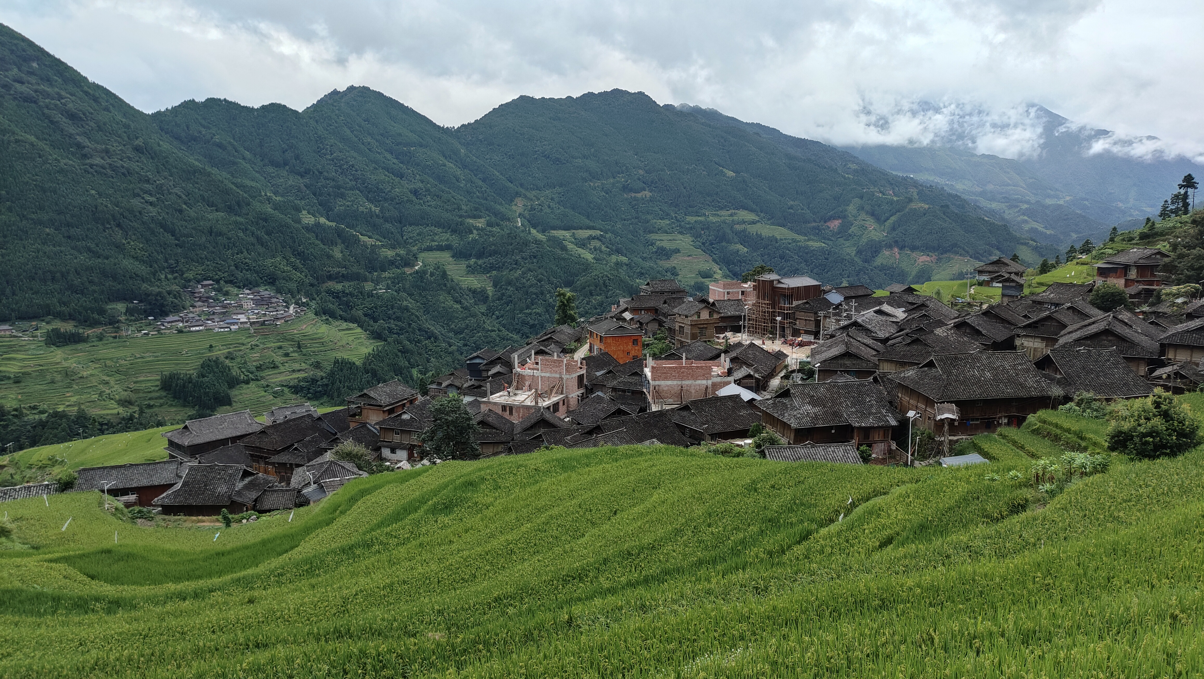 加榜梯田从山下到山顶沿乡村公路两侧层层叠叠依次展开,有的地方像打开的扇面,有的地方如同一组组褶皱的曲线,无论从哪个角度去看,都非常符合构图美学。观光车一路盘旋上行二十五公里,途经党扭、加页、加车三个苗族村寨,把我们送到了山顶。站在观景台举目四望,蔚蓝的天空、错落的山峦、游走的白云、浓绿的梯田、成片灰色屋脊的苗寨,构成了一幅绝美的自然画卷,以至于本来没打算在这里留宿的我们意见高度统一地临时决定在山顶民宿住一晚,享受一下早晨被鸟鸣吵醒、推开窗户就是洁白的云朵和绿油油的梯田的山民待遇。