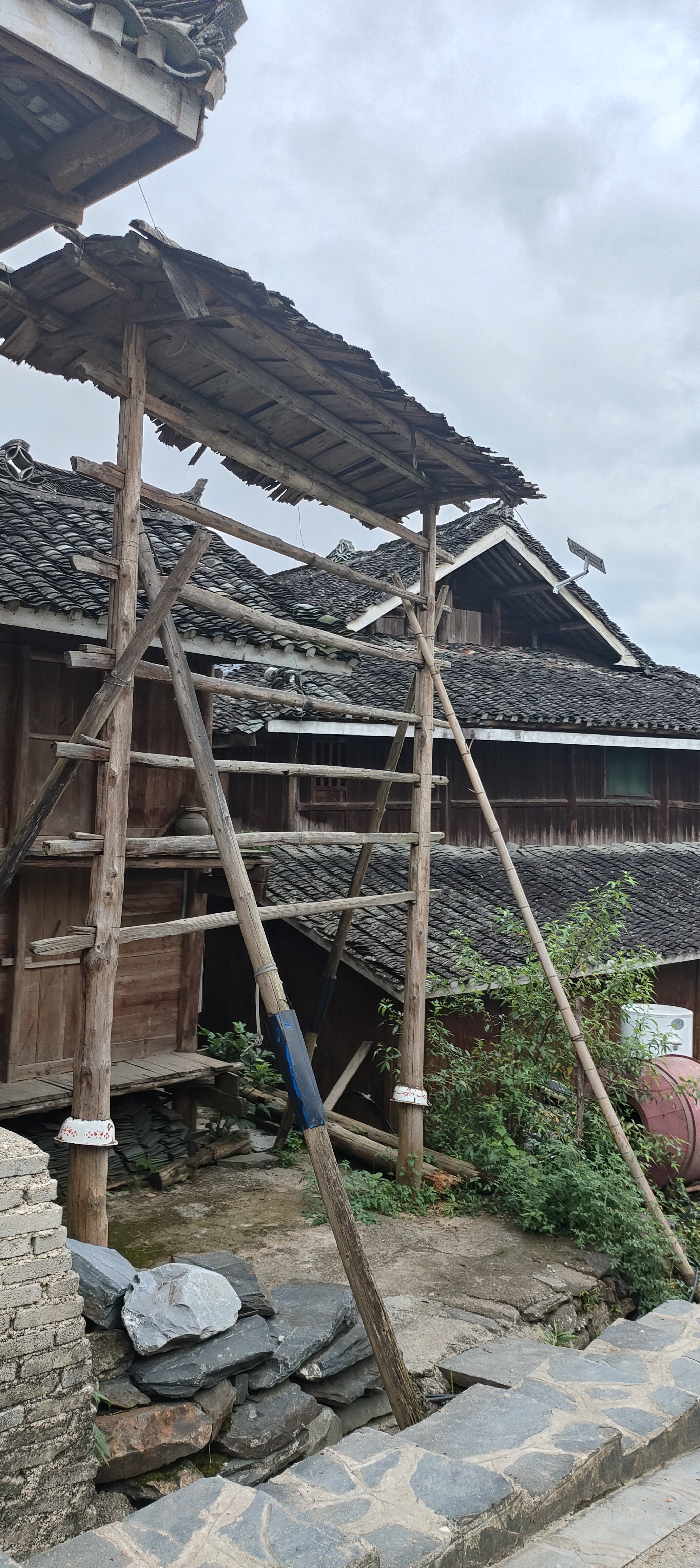 不管是在寨子里还是在梯田的边上,常见有木制的架子,两根边柱栽入泥土里,边柱间是三到五根横杆,架子最上边是用木板或者稻草搭起来的屋脊形状的顶棚,整体的样貌颇似学校操场边的运动器材“云梯”。我好几次发挥想象都猜不到这个架子到底有什么用场,后来在田边遇到一位老农,才问出了答案——这是晒稻子用的。将收割的稻子打捆,成双成对搭在横杆上晾晒,上边有顶棚,以防被雨水淋。在“天无三日晴”的贵州,这是苗族人民智慧的结晶。