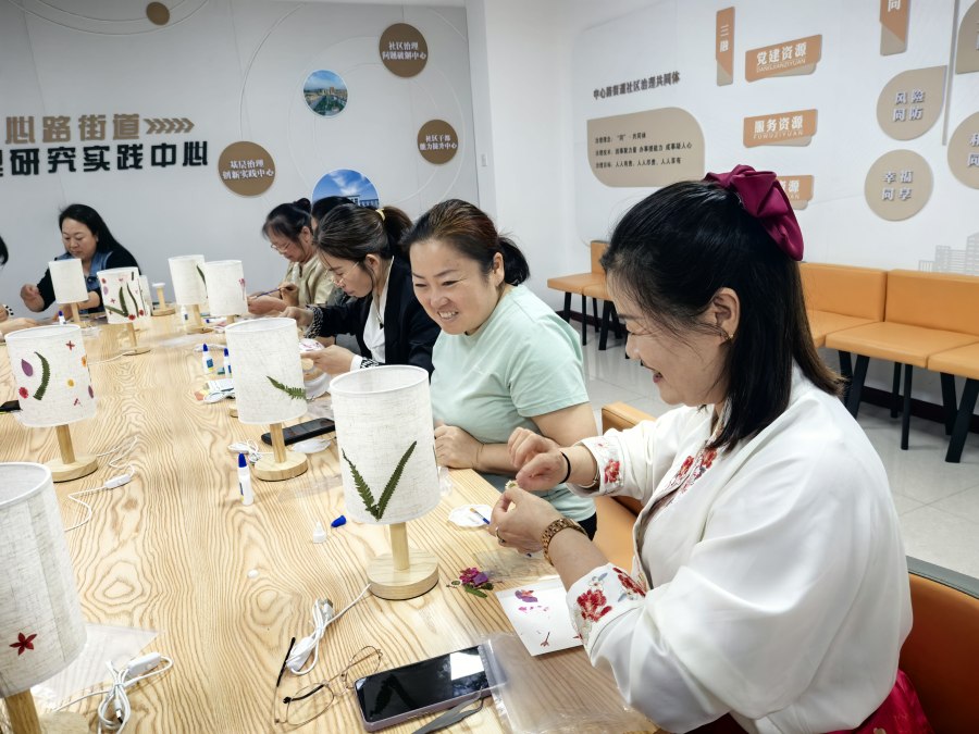 制作现场温馨而专注。社区居民李阿姨正在教一位快递员如何搭配花材:"你看,这样摆放,等会儿灯光一照,影子会特别美。"网格长兴奋地交换着手中的花瓣材料,户外劳动者与社区居民共同创作,现场洋溢着欢声笑语。