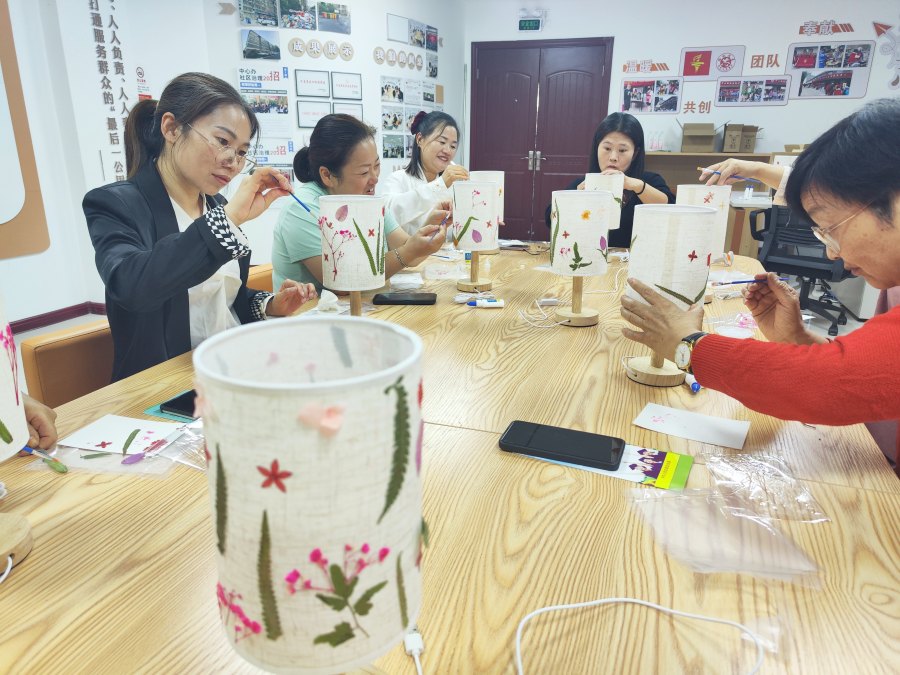 玫瑰花瓣化作明月下的云朵,满天星点缀成夜空繁星,各色压花在灯罩上组成一幅幅诗意画卷。非遗压花工艺在现代花灯上焕发新生,传统技艺在社区居民的巧手中得到传承。