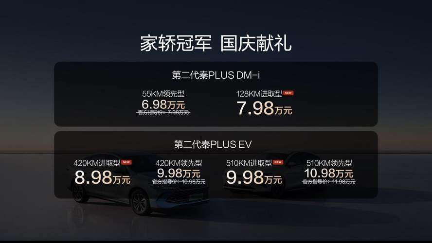 9月25日,比亚迪第二代秦PLUS双车上新,发布了秦PLUS DM-i 128KM进取型、秦PLUS EV 420进取型、510KM进取型等三款新车,同时全系车型享国庆献礼价,限时6.98万元起。