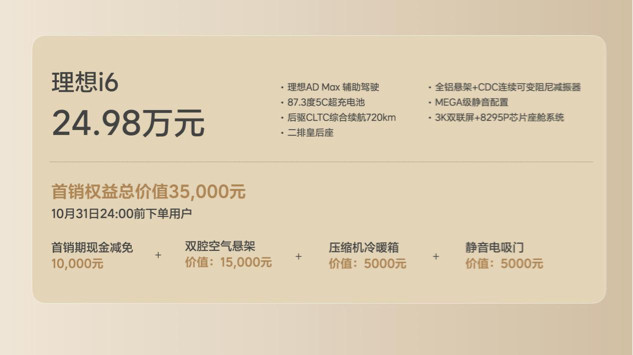 即日起,理想i6可以通过理想汽车官网或理想汽车App进行订购。2025年10月31日24:00前确认订购的理想i6用户,将享受10,000元的现金减免权益,以及双腔魔毯空气悬架、智能冷暖双用冰箱、全车静音电吸门的免费赠送权益,限时首销权益可与其他权益叠加使用。