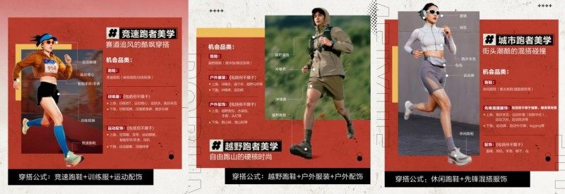 沈阳马拉松出圈的⌈跑者美学⌋趋势,承载了抖音商城跑步季对不同场景跑者需求的深入挖掘,并精准洞察不同跑步人群需求,聚焦不同跑步品类货盘,推出不同风格穿搭,重磅发布⌈跑者美学⌋穿搭新趋势。针对“上班通勤、下班开跑”的城市跑步人群,推出主打“休闲跑鞋+先锋混搭服饰”的⌈城市跑者美学⌋风格穿搭;针对“要舒适排汗、又要防风防雨”的越野跑步人群,推出主打“越野跑鞋+户外服装+户外配饰”的⌈越野跑者美学⌋风格穿搭;针对“能拉高配速、又能秀出审美态度”的专业跑步人群,推出主打“竞速跑鞋+训练服+运动配饰”的⌈竞速跑者美学⌋风格穿搭。