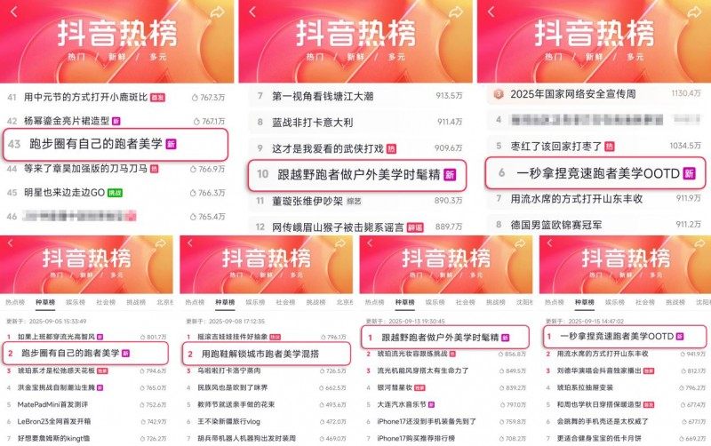 在抖音站内,围绕「跑者美学」趋势、沈阳马拉松合作大事件和城市/越野/竞速三大核心场景,通过六大热点内容策划,抖音达人矩阵联动演绎,引爆⌈跑者美学⌋穿搭新趋势,纷纷登上抖音种草榜,实现场景化种草。其中#跑步圈有自己的跑者美学 话题曝光量超1.4亿,登上热榜TOP43;面向户外越野跑场景的#跟越野跑者做户外美学时髦精 话题,总曝光量达1526.9万,占位热榜TOP10;#一秒拿捏竞速跑者美学ootd 精准触达并种草想要跑得又快又好看的专业竞速跑者,最终亮相抖音种草榜TOP1,热榜TOP6。